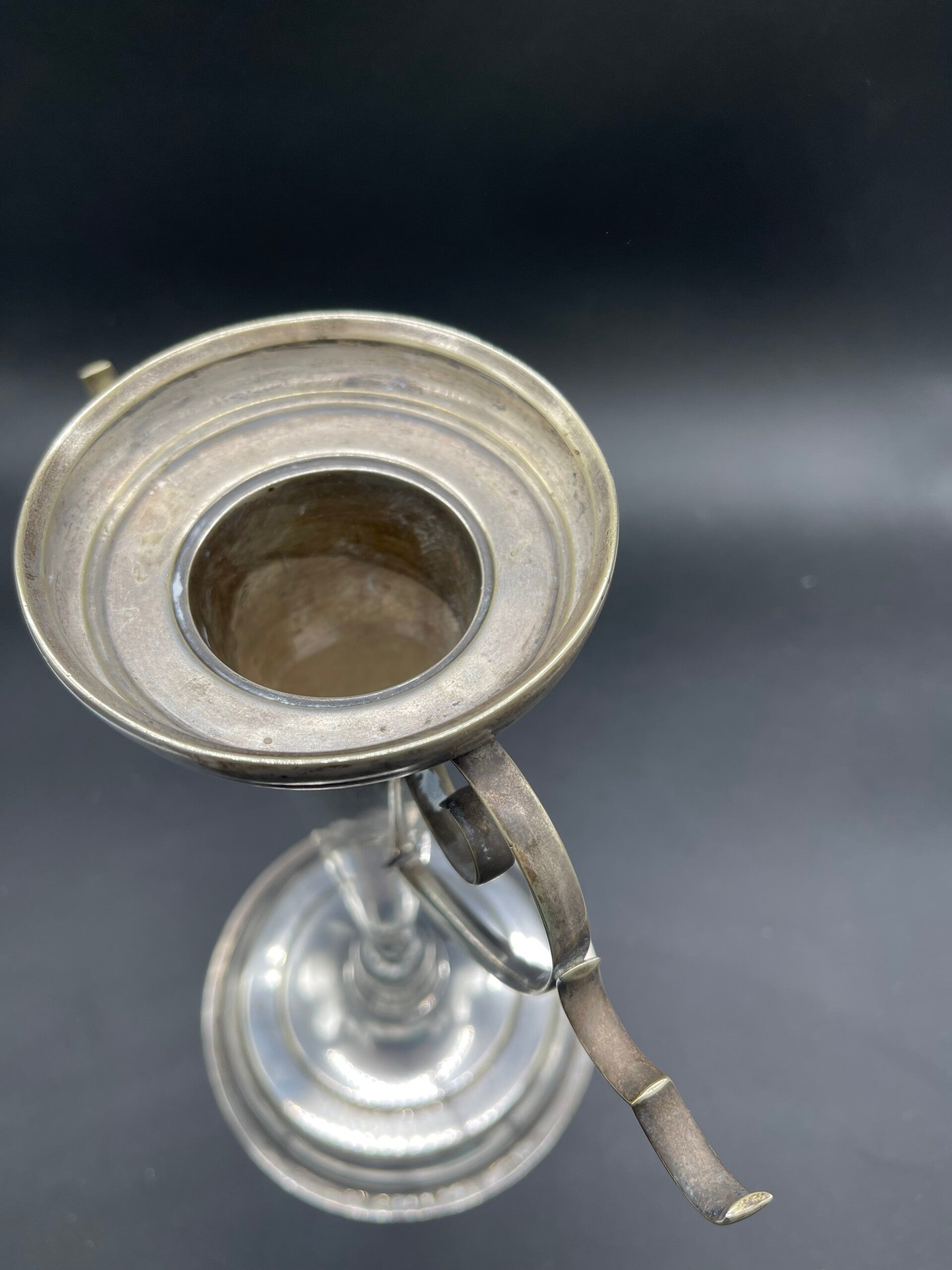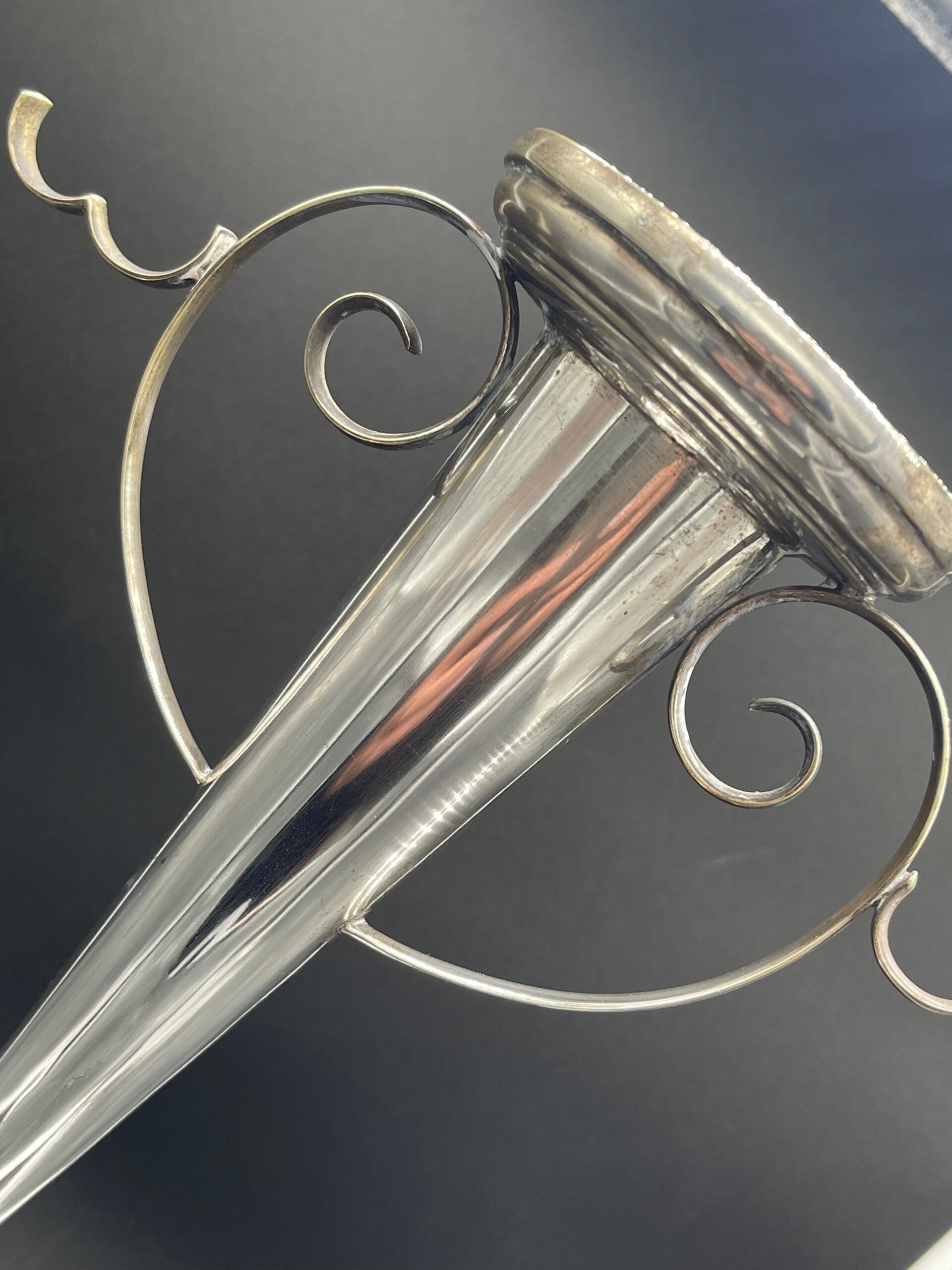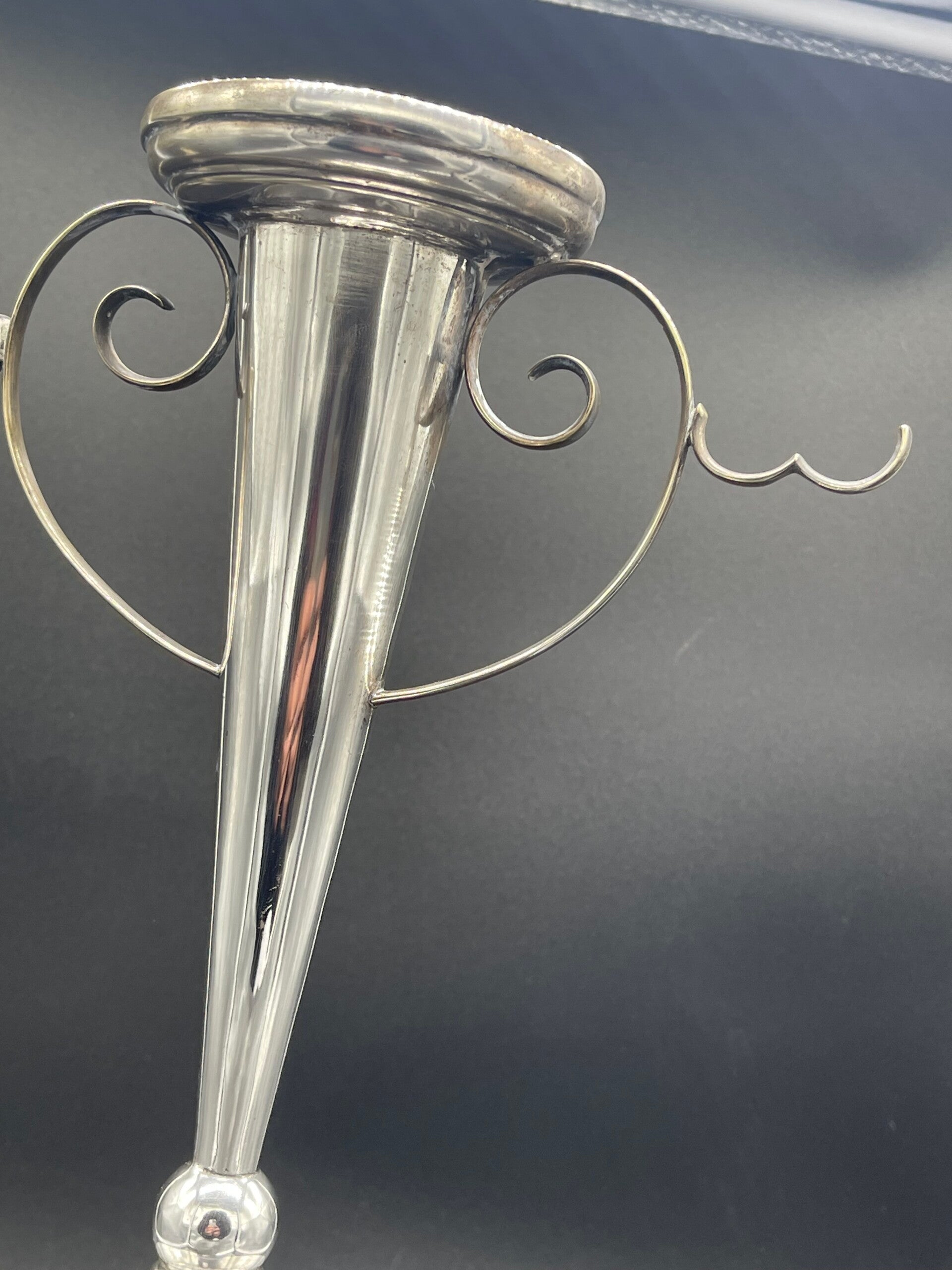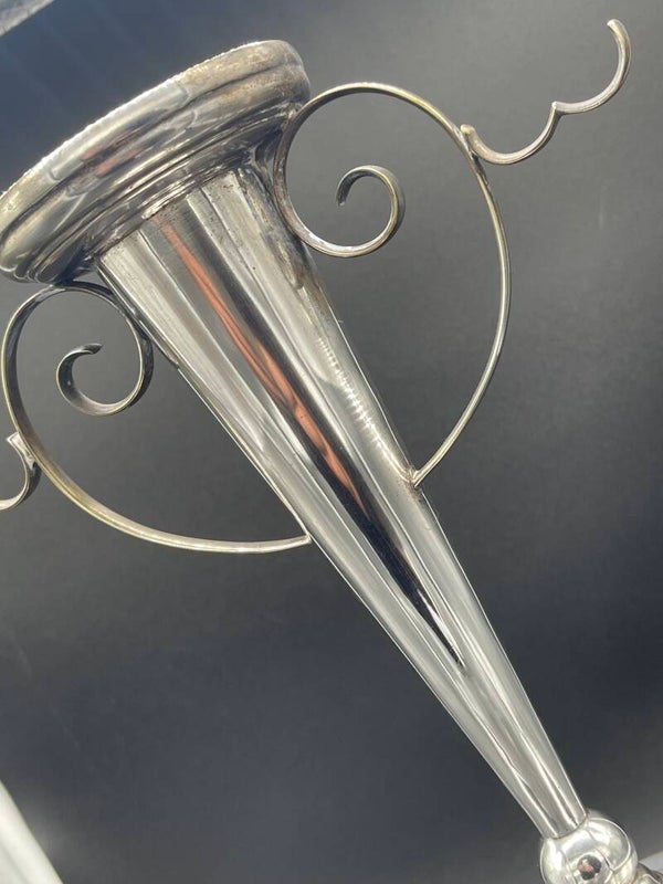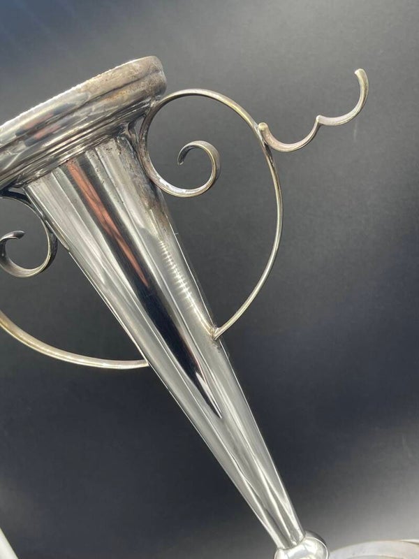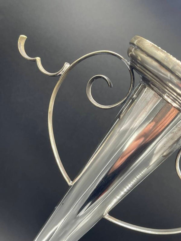 The silver-plated trumpet vase can be used to hold a posy of flowers or even a candle and has striking curled decorations which can be used to hang flowers, grapes or other delicacies.