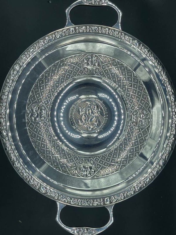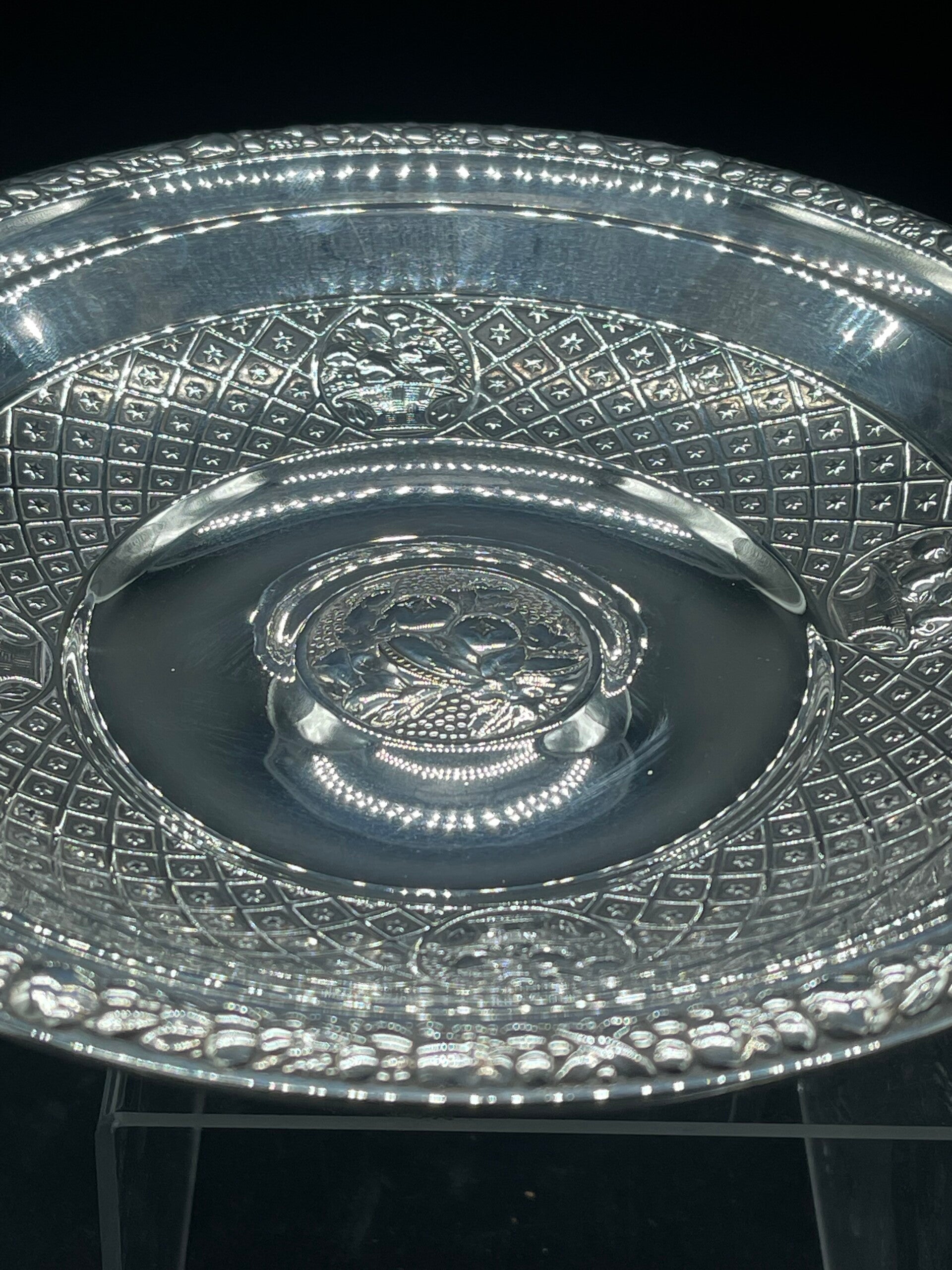 The striking twin-handled antique is decorated with an embossed centre feature of a bowl of fruit with a band of stars and fruit. The rim features a raised design of fruit.