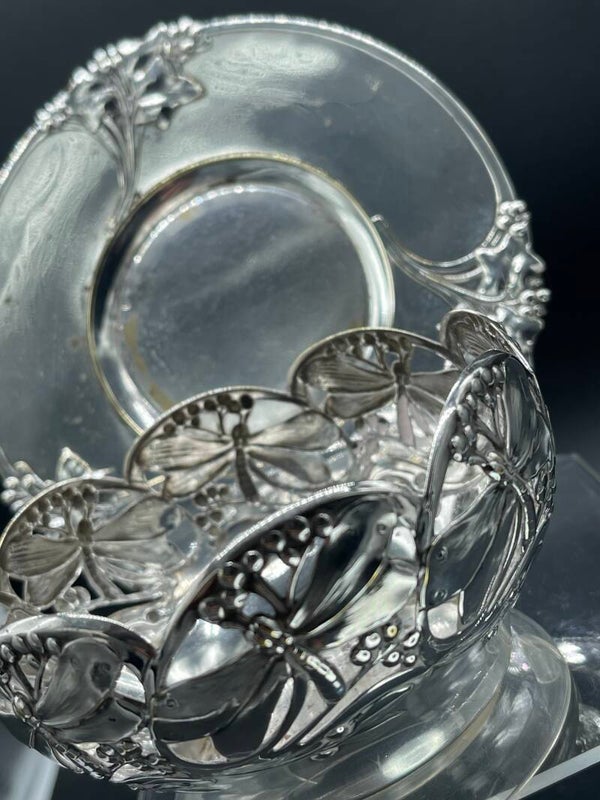 Art Nouveau WMF Silver Plate Bowl & Plate – Dragonfly & Mistletoe Design. Circa 1905.