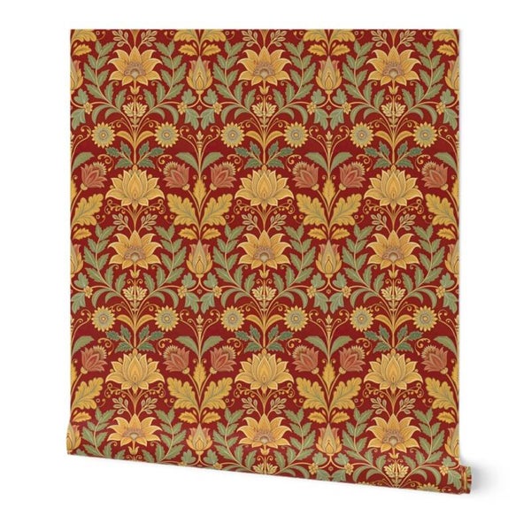 Elegant Art Nouveau floral pattern from an original 1910 design plate. Golden blooms, sage leaves, and warm red tones create a timeless heritage style, perfect for fabric, wallpaper, and luxury home décor projects.
