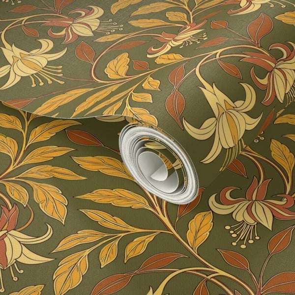 Golden fuchsias with flowing leaves bloom across a rich olive ground in this Art Nouveau pattern. Elegant and timeless, it’s ideal for fabrics, wallpaper, and home décor with heritage charm.